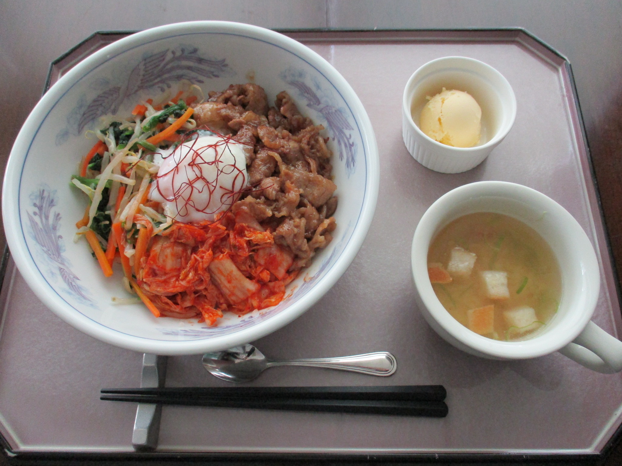 10月28日のランチ 牛肉ビビンバ温泉卵添え アイス付