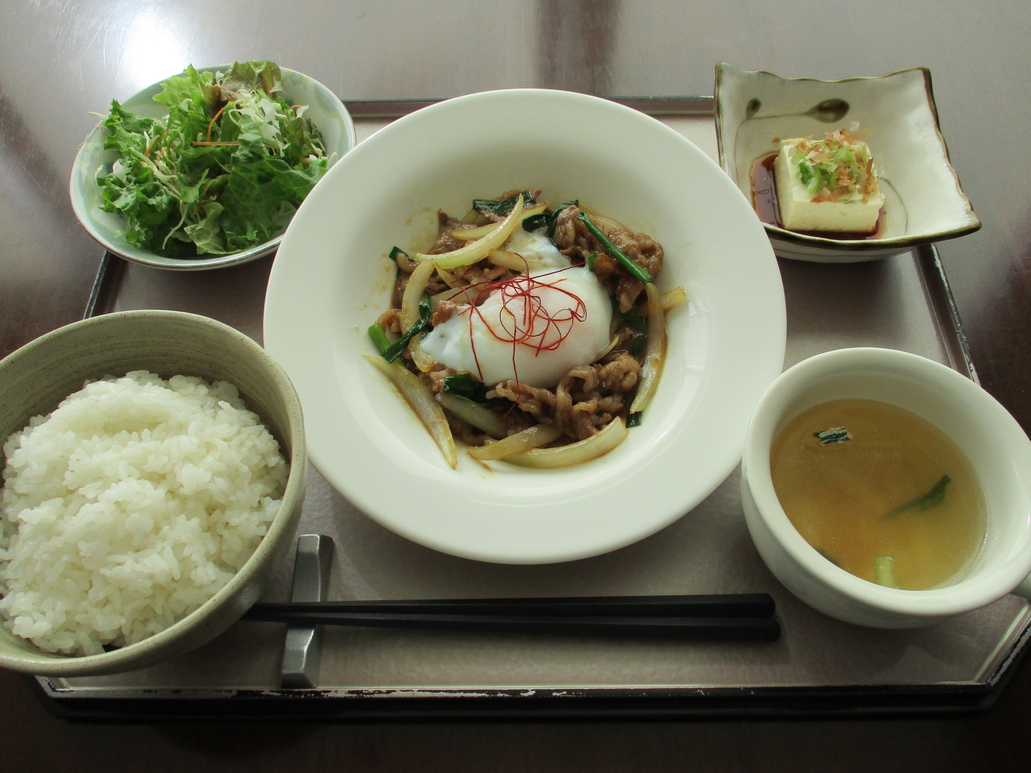 11月12日のランチ 牛肉のスタミナ焼き温泉卵添え