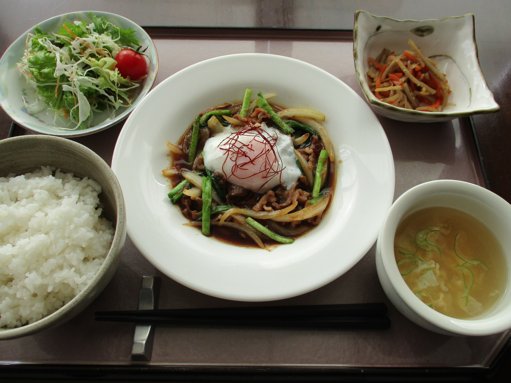 12月23日のランチ 牛肉スタミナ焼き 温泉卵添え