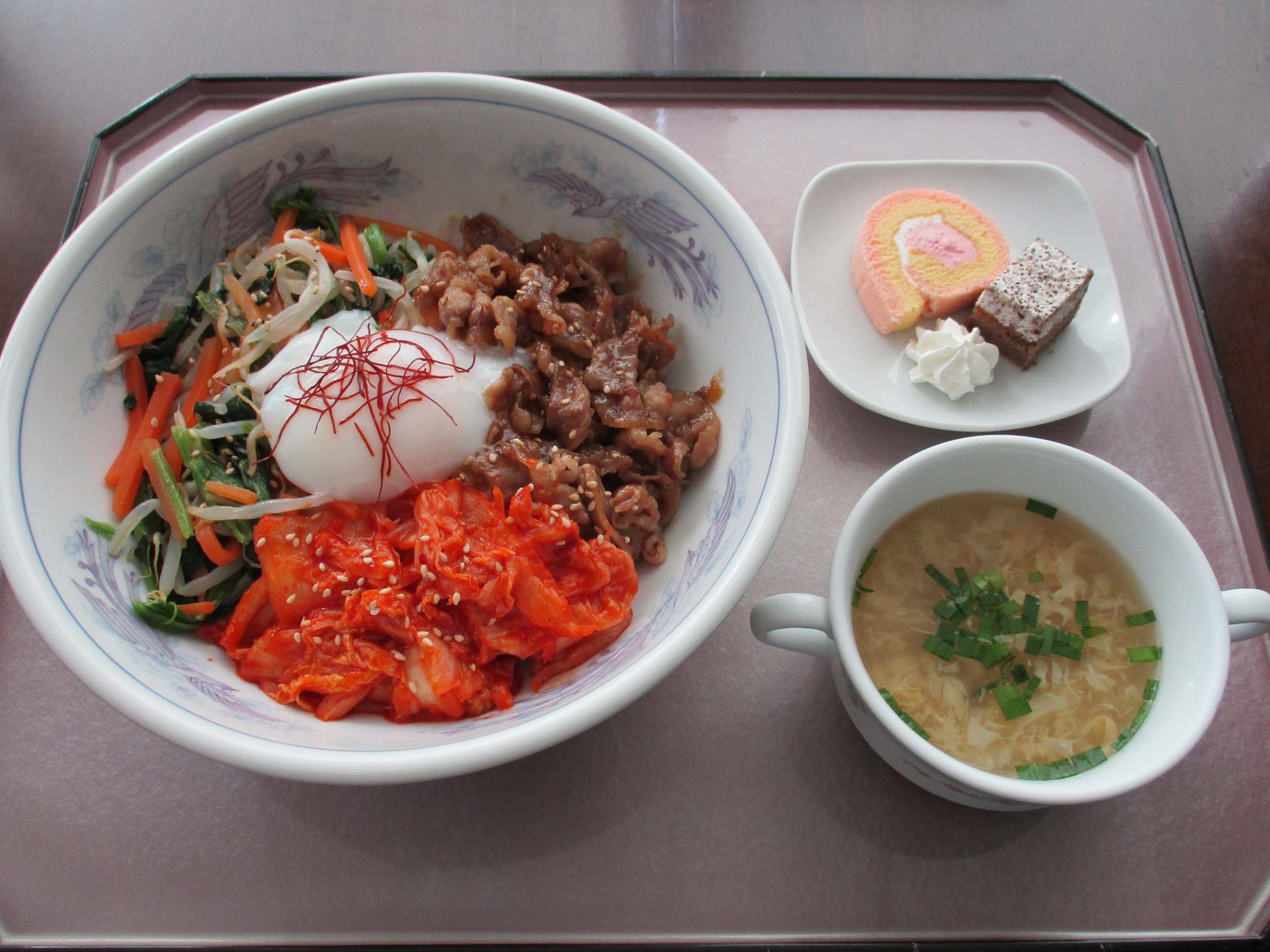 1月7日のランチ 牛肉ビビンバ温泉卵添え デザート付