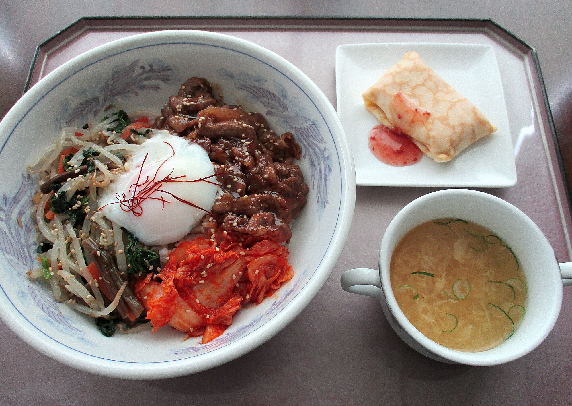 3月16日のランチ 牛肉ビビンバ 温泉卵添え