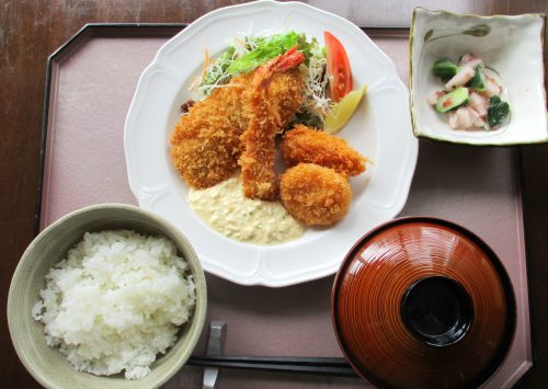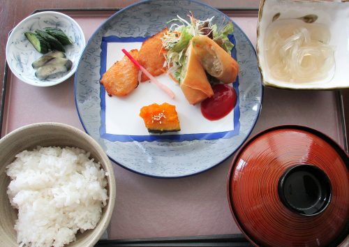 10月9日のランチ 白身魚西京味噌焼と春巻盛り合せ