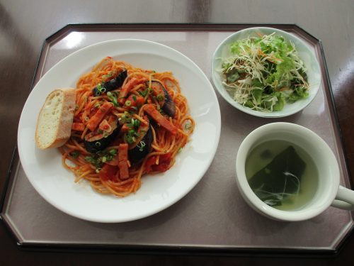 10月10日のランチ 秋茄子とベーコンのトマトパスタ