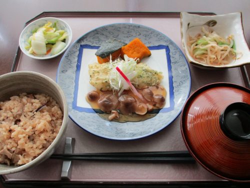 12月4日のランチ 白身魚の唐揚げときのこご飯